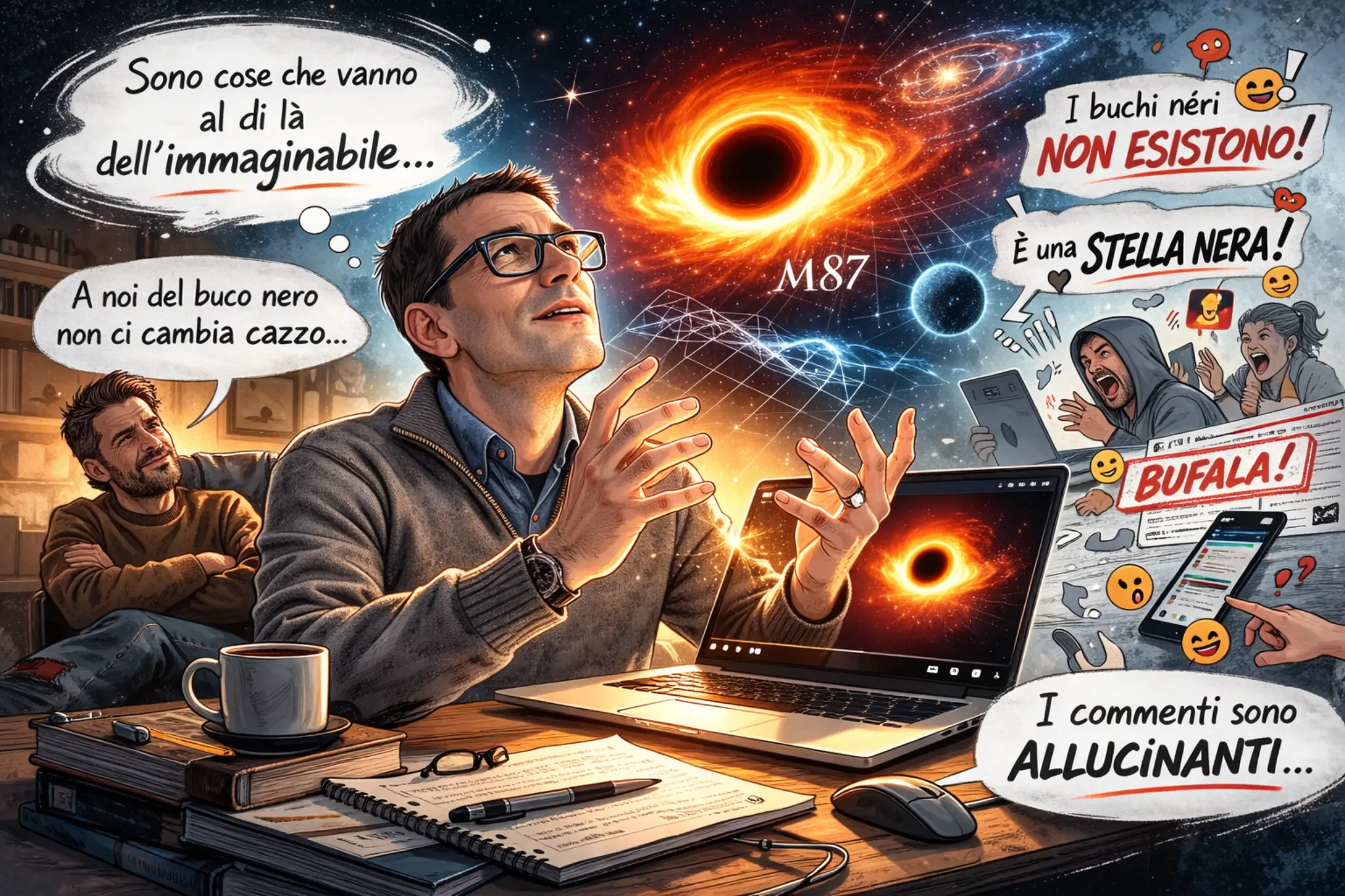 A proposito di cose impressionanti: il 10 aprile l’umanità vede per la prima volta la foto di un buco nero. Roberto è in trance mistica. Da giorni spiava i rumor, si era guardato i video divulgativi su YouTube, aveva scoperto che l’immagine del buco nero in Interstellar non era fantasia ma previsione matematica basata sulla relatività generale. La foto arriva: la galassia M87, non Sagittarius A come pensava inizialmente. “Sono cose che vanno al di là dell’immaginabile,” mormora. Rocco apprezza ma raffredda gli entusiasmi: “A noi del buco nero non ci cambia cazzo. È una conferma delle teorie di Einstein, bella per carità, ma nella vita di tutti i giorni non cambia assolutamente nulla.” Roberto si inalbera: il punto non è l’utilità pratica, è “l’idea dell’uomo che supera i confini di quello che dovrebbe fare, un essere non fatto per volare che ti dice sti cazzi, io vado avanti.” Entrambi concordano, però, su una cosa: i commenti sui forum sono allucinanti. Gente che scrive che i buchi neri non esistono e quella è “una stella nera.” Cento anni fa, riflette Roberto, gli stupidi venivano messi ai margini. Oggi fanno il bello e il cattivo tempo. La democrazia digitale, a volte, è una maledizione.