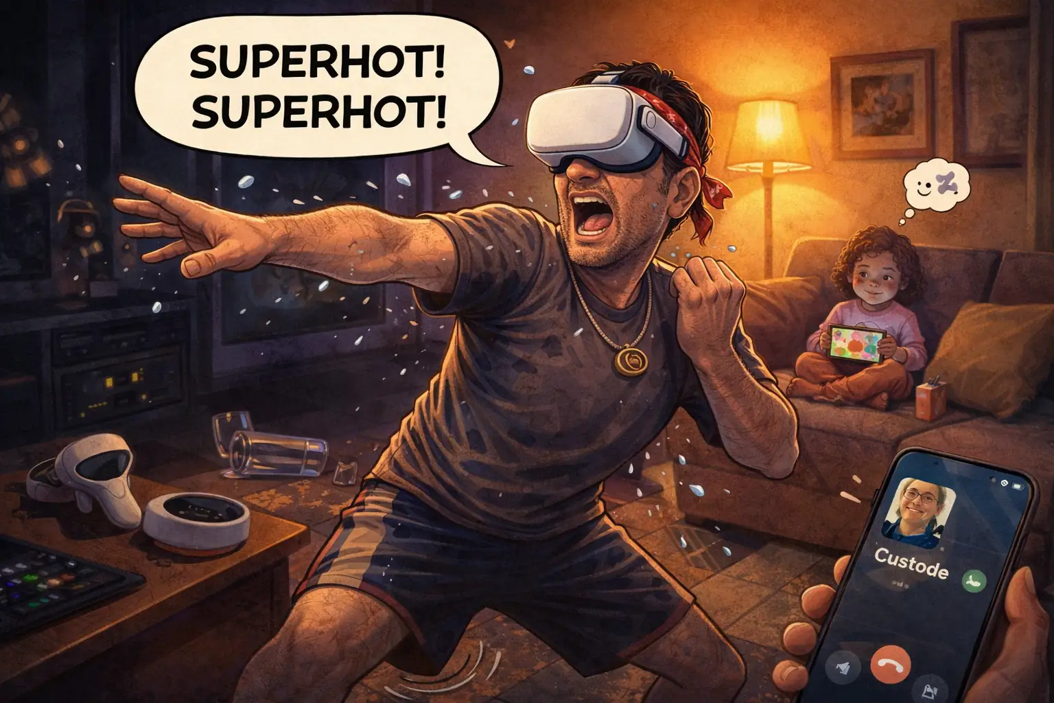 Ma è l’Oculus Quest del fratello a rapirlo nel primo pomeriggio del Capodanno. Alessandro torna a casa dal pranzo di famiglia trasformato. In un vocale torrenziale racconta ai due amici l’esperienza della realtà virtuale con la foga di un esploratore che ha scoperto un continente. C’è quel gioco tattico, tutto poligoni e wireframe, dove il tempo rallenta e ti arriva un tizio col coltello alla pancia mentre un altro ti spara e un terzo corre verso un fucile a pompa — e tu devi risolvere l’equazione in un secondo. C’è Synth Riders, con le spade laser e i cubi da spaccare a ritmo di musica, che aveva comprato come regalo al fratello convinto fosse una cagata e invece è una figata cosmica. E poi c’è lo sparatutto in prima persona, quello dove ti muovi davvero, e Alessandro deve levarsi il caschetto dopo tre minuti perché gli viene da vomitare. “Cari amici, quasi quasi lo compro solo per quei due giochi,” annuncia, con il tono di chi ha già deciso.