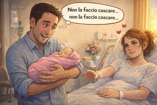 Poi arriva la settimana che cambia tutto. Luisa si ammala — “febbre e diarrea, porella” — e la suocera viene in soccorso per Caterina. Roberto racconta la sera da padre rincoglionito: deve mettere il pigiamino a Caterina, apre il cassetto, non c’è. Secondo cassetto, terzo cassetto, niente. “Che fa un papà rincoglionito quando non trova il pigiamino? Riveste quei stessi vestitini de casa e la mette a dormire così.” Alle quattro e mezza si sveglia Luisa, trova la figlia vestita, probabilmente manda qualche accidente, e da un cassetto magico — “io sono sicuro che in casa mia ci sono i cassetti magici” — tira fuori il pigiamino e la cambia.