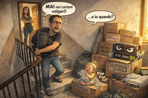 Una mattina, causa distrazione e un episodio di Masha e Orso finito troppo presto, Caterina prende il cellulare del padre. Lui è in bagno a lavarsi i denti. La bimba, che già clicca con il ditino — “vabbè, tutti i bambini, anche Leonardo da infante cliccava” — raggiunge il telefono, lo afferra, cerca di mandare avanti il video, fa partire una chiamata alla madre, lo butta per terra, e ci cammina sopra con le scarpine. Il cellulare era caduto almeno venti volte, una volta perfino alla stazione di Paola quando accompagnava Sandrino, senza un graffio. Eppure Caterina gli distrugge lo schermo. “Ecco, sto a parlare dal mio Moto X Motorola con lo schermo tutto in frantumi.” Sandrino pontifica: “Mai dare ai bambini telefoni o tablet. Noi siamo campati benissimo senza. E questo ti sia di lezione, Roberto.” Ma Roberto ha già comprato il sostituto: un nuovo Motorola a duecentoventinove euro — “che poi rosico parecchio perché il giorno dopo Amazon l’ha messo in offerta a duecentonove” — scelto per il prezzo, la user experience quasi stock di Android, e soprattutto lo spazio: sessantaquattro giga contro i sedici del vecchio Moto X, di cui otto occupati dal sistema operativo. “Per tre anni sono andato in giro con un telefono che aveva solo otto-nove giga. Non puoi fare un video, una foto, un Cristo e una Madonna.”