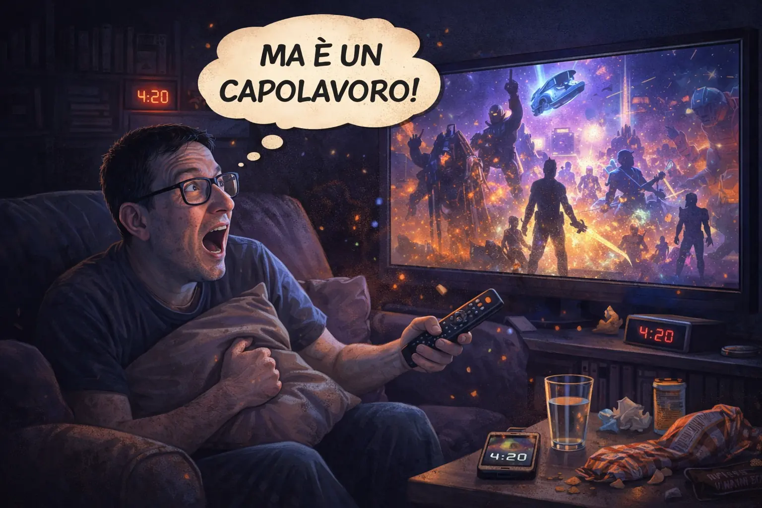 Roberto, una sera, decide finalmente di guardare Ready Player One. Lo fa con quattro anni di ritardo, dopo che amici, parenti e conoscenti gliel’avevano consigliato con ogni mezzo lecito. E la reazione è un’esplosione nucleare di entusiasmo nerd: “Ma è un capolavoro assoluto!” Da mezzanotte alle 4:20 del mattino, Roberto sta incollato allo schermo, fermando e riavvolgendo ogni scena per catturare tutte le citazioni nascoste. Due ore di film diventano quasi quattro. Si fustigherà per giorni per non averlo visto prima. “Ma perché non mi avete frustato fino a oggi?” chiede, in ginocchio davanti al telefono. Sandrino, dal canto suo, conferma che il film è bellissimo ma aggiunge il colpo di grazia: il libro è dieci spanne sopra. Roberto non batte ciglio: “Vabbè, ho capito. Me lo devo comprare.” E parte subito il dilemma amletico su Amazon: copertina rigida o flessibile? Ci ballano 2€. Si andrà di flessibile, ovviamente.