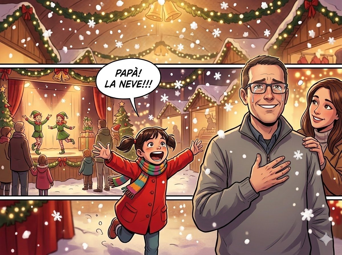 Roberto, dal canto suo, non è da meno in quanto a sfide esistenziali, ma le sue sono di tutt’altra natura. La trasferta a Milano per l’Immacolata, organizzata principalmente per Caterina, si rivela sorprendentemente bella. Il pranzo con i cugini buontemponi di Luisa lo riporta ai vecchi tempi degli sbevazzamenti in compagnia, e il villaggio di Babbo Natale regala un momento che il Custode racconta con la voce che gli trema. Caterina, che non ha mai visto la neve vera, si ritrova sotto una pioggia di schiuma che simula fiocchi di neve, e la sua reazione — «Papà, la neve! Papà!» seguita dal tuffo in mezzo al palco — commuove Roberto fino alle lacrime. «Papà, ma è questa la neve?» chiede poi la bambina. E quando la mamma le spiega che è schiuma, non neve vera, la risposta è immediata e definitiva: «Allora mi ci porti a vedere la neve papà a questo inverno?» Roberto, nel buio del suo vocale, fa una promessa: fosse l’ultima cosa che fa nella vita, deve portare sua figlia a vedere e toccare la neve vera.