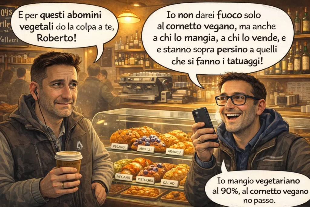 Sempre in tema gastronomico, Roberto commette il crimine sociale di bersi un cappuccino alle dodici e cinquanta. Un ragazzo al bar lo guarda, ordina una birra, e tutti e due, lui e la barista, si mettono a ridere. Sandrino esulta: la vendetta del cappuccino colpisce anche a distanza. Ma il vero campo di battaglia culinario è la pinza romana, che sta invadendo il mondo della ristorazione come i cornetti vegani stanno invadendo i bar. Al ristorante Paradiso di Velletri, dove Rocco ha cenato con una ventina di persone spendendo 21 euro a testa, la pinza è arrivata quasi alle dieci di sera. Roberto, da emigrato calabrese, scopre che persino in Calabria i locali hanno abbandonato la pizza per la pinza. Il Clibanaro, quello della maxi pizza, improvvisamente fa solo pinza. Roberto non l’ha mai digerita, letteralmente. Per lui, cornetto vegano e pinza sono la stessa faccia della medaglia del male che pervade il mondo.