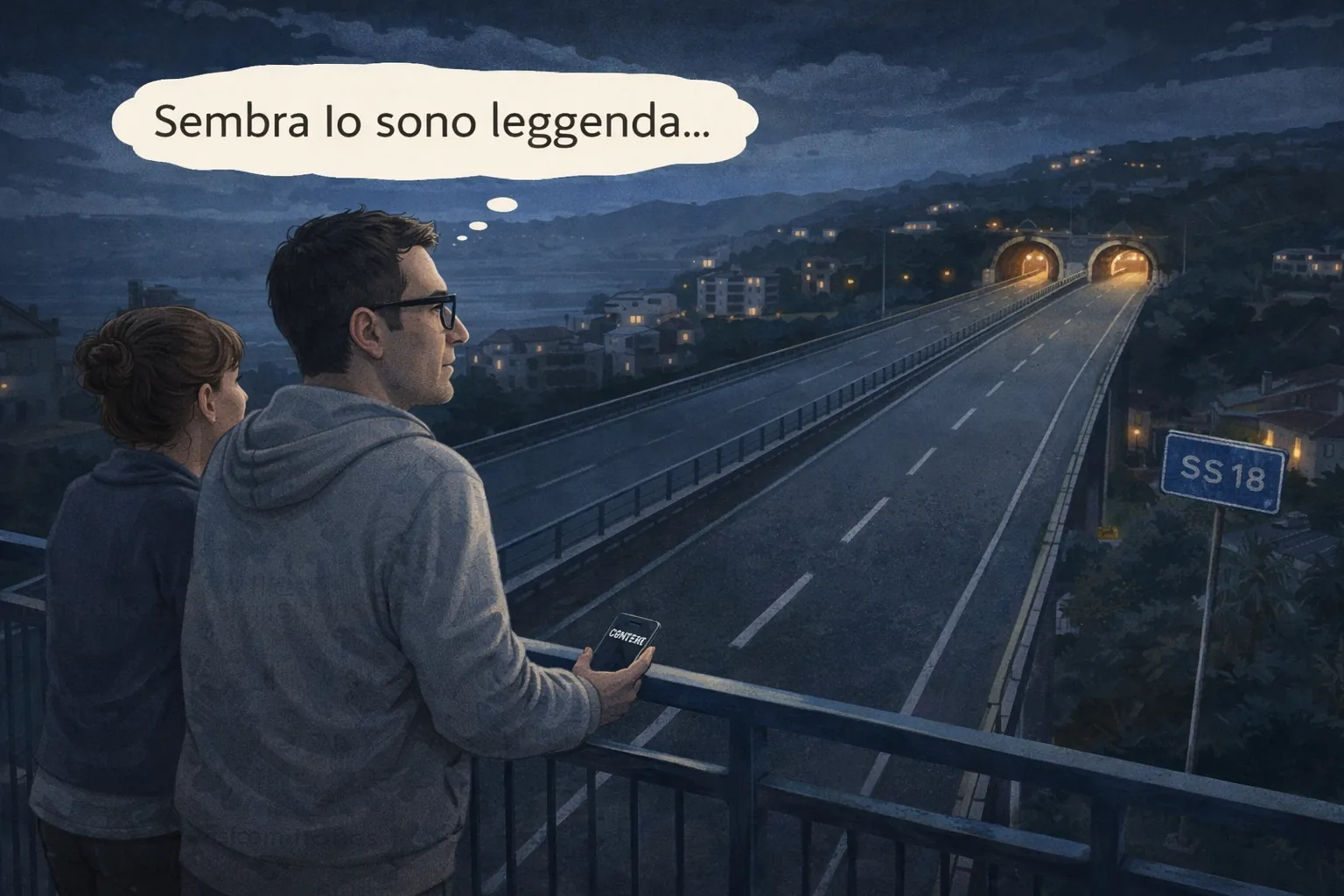 Una sera, Luisa chiama Roberto sul balcone. “Vieni un attimo,” gli dice. Stanno lì, dieci minuti, a fissare il ponte della SS18, la statale che passa sopra Guardia con le sue gallerie. Quel ponte è sempre trafficato, a qualunque ora del giorno e della notte: macchine, camion, il rumore costante della civiltà in movimento. Quella sera, non passa nessuno. Non una macchina, non un camion. Solo il vento, qualche insetto, gli uccelli. “Sembrava di stare in Io sono leggenda,” dice Roberto, e in quella frase c’è tutto lo spaesamento di un uomo che guarda il mondo fermarsi dalla finestra di casa sua.