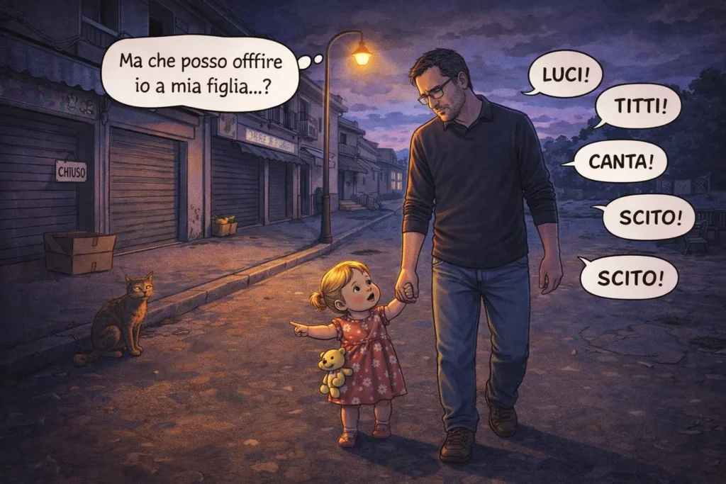 A metà settembre arriva un momento di malinconia vera. Roberto porta Caterina a spasso per Guardia la sera. Lei vuole fare i suoi riti: vedere i gattini, il negozietto con Minnie e i PJ Masks, la bancarella di Titti, il palco dove cantavano in piazza, lo scivolo al parco. Ma è tutto chiuso, smantellato, sparito. “Luci, luci!” dice Caterina davanti al negozio spento. “Titti, Titti!” nella piazza vuota. “Canta, canta!” dove non c’è più il palco. “Scito, scito!” ma il parco è al buio. Roberto la guarda e si chiede: ma che posso offrire io a mia figlia in un posto dove dal 31 agosto non c’è più nulla? Una città dove non c’è niente da fare se non andarsene. Il pensiero lo logora, lo tiene sveglio mentre costruisce l’ultimo pezzo di Voltron. Sa di deprimersi con poco, sa che i problemi seri della vita sono altri, ma la domanda resta: che stimoli può dare a sua figlia in una città mortorio?