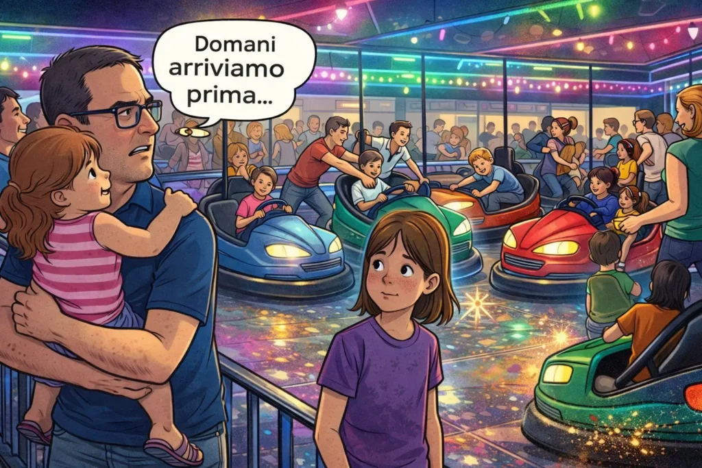 Intorno alla metà del mese, Roberto racconta l’episodio degli autoscontri con una gravità quasi biblica. È sera, Caterina in braccio, la cuginetta Viola — una decina d’anni — vuole salire sull’autoscontro. Fanno la fila. E lì Roberto vede, nelle sue parole, “la meschinità, mediocrità, caducità dell’essere umano in tutta la sua pienezza”: mamme assatanate che a ogni cambio turno cacciano a forza i propri figli dentro le macchinine allontanando gli altri bambini, genitori che comprano gettoni in continuazione così il figlio non scende mai, bimbi soli che aspettano invano il loro turno. Quaranta minuti in piedi con Caterina in braccio. Viola non fa un singolo giro. Alla fine è la bambina stessa a dire: “Va bene zio, dai, torniamo domani sera.” E Roberto, sconfitto, si ritrova a insegnare a Viola il gioco sporco: “Domani arriviamo prima, ci sediamo su una macchinina e non ci alziamo più finché non ci vengono le piaghe da decubito.” Ha abbassato i propri principi al livello del branco. Se non avesse avuto Caterina in braccio, confessa, “mi sarei messo a far cazzotti con chiunque. Le avrei anche prese, perché c’erano papà decisamente più energumeni di me. Ma me ci sarei buttato a capofitto.”