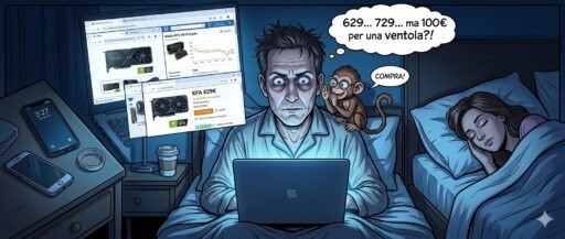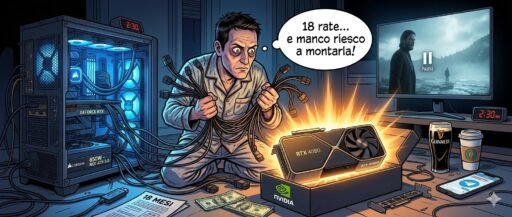 Nel frattempo il mondo della tecnologia non dorme mai, e Rocco si presenta puntuale al Computex come un inviato di guerra sul fronte dei nanometri. AMD ha svelato sulla carta i nuovi Ryzen serie 9000, Intel risponde con la linea mobile 200, e Rocco analizza slide su slide con la precisione di un analista finanziario che studia un bilancio trimestrale. Sandrino, dall’altra parte, si ritrova in quel limbo esistenziale che conosce bene: nessun PC portatile, nessuna console, nessun gioco nuovo, e nessun portafoglio abbastanza gonfio per comprare qualcosa. “È quel periodo dell’anno in cui di solito mi compro qualcosa, ma quest’anno non mi posso comprare niente.” Lo dice con la stessa rassegnazione di chi guarda la pioggia dalla finestra di un ristorante chiuso. Si vocifera di una console portatile Xbox, e per un attimo gli occhi gli brillano, ma l’annuncio non arriva.
