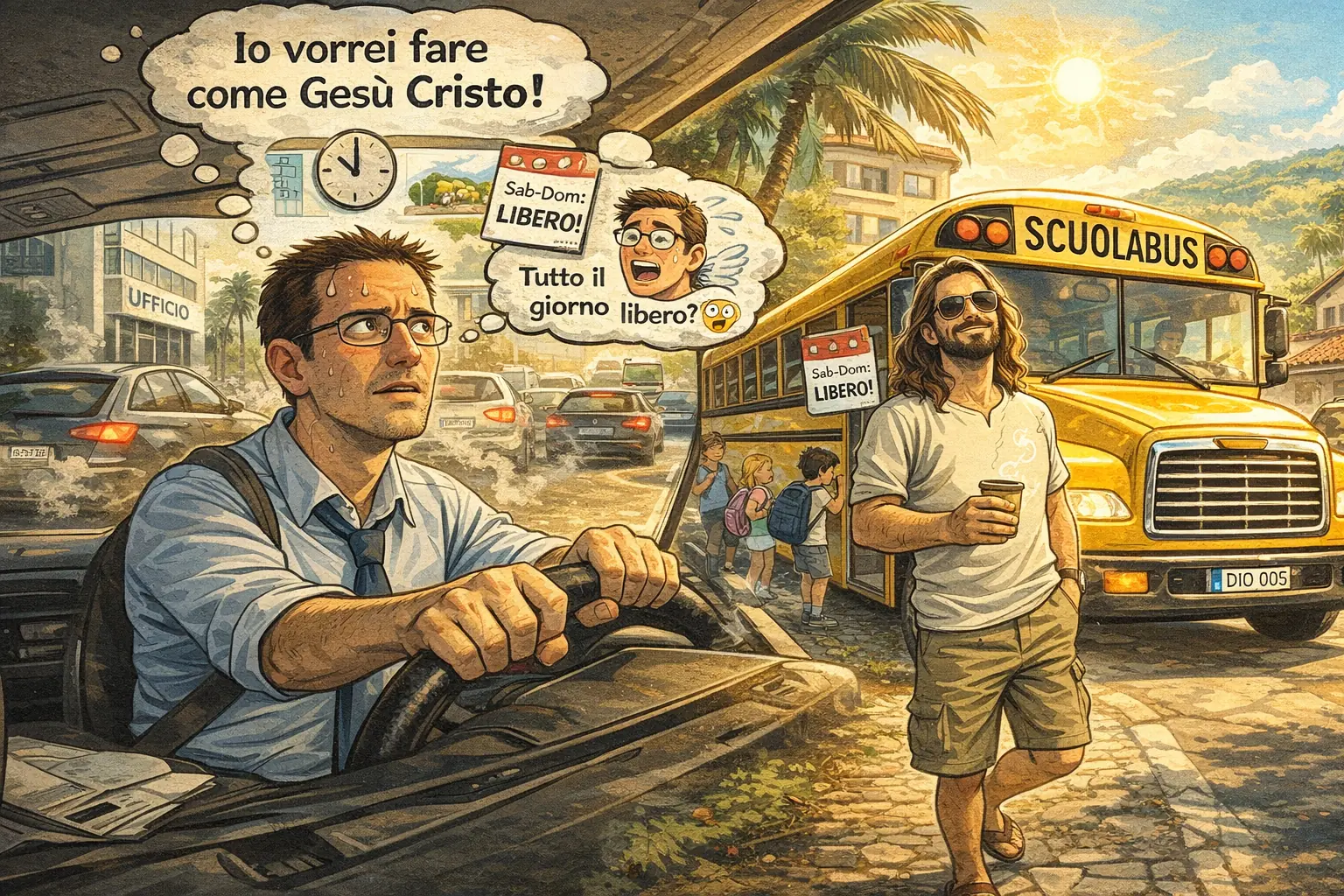 Mentre tutto questo accade, Roberto fa una scoperta che cambierà per sempre il suo modo di vedere il lavoro e la vita. Nel condominio sotto di lui è venuto ad abitare un mesetto fa un uomo che tutti chiamano Gesù Cristo. Non perché sia il figlio di Dio, ma perché per anni ha fatto la parte di Cristo nella rappresentazione della Passione a Guardia. È un omone grande con la chioma fluente, sposato con una ragazza bellissima, e ha trovato la perfezione nella vita. Guida il pulmino giallo della scuola, quello che si vede nei Simpson. Si alza alle sei e mezza, va a prendere i bambini, li porta a scuola. Poi torna a casa, si fa una doccia, va al bar, passa la mattinata lì o va a correre. A mezzogiorno riparte, va a riprendere i bambini, li riporta a casa. Finito. La sua giornata lavorativa è conclusa. Il sabato non lavora, la domenica non lavora. Tutti i giorni fa mezza giornata.