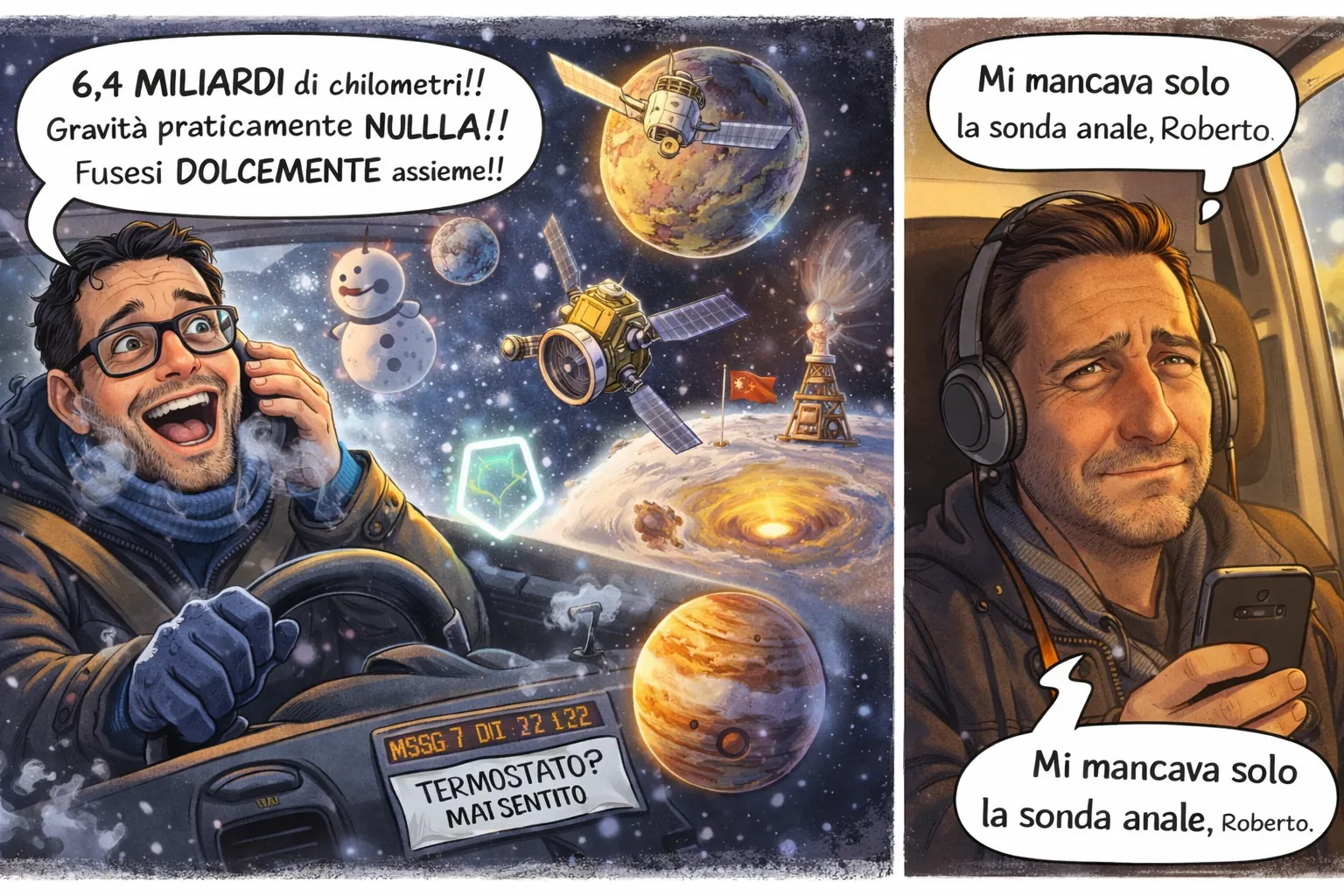 L’anno nuovo si apre con Roberto alla guida della sua Grande Punto senza termostato, senza volante termico, senza riscaldamento degno di questo nome, diretto verso Scalea a 7 gradi centigradi con le mani congelate sul volante. Ma Roberto ha ben altro in testa: il 2019 si è inaugurato con quattro sonde in giro per il sistema solare, e lui ha intenzione di raccontarle tutte quante, una per una, in una serie di messaggi vocali che coprono l’intero tragitto casa-lavoro. Sandrino e Rocco sono avvertiti.